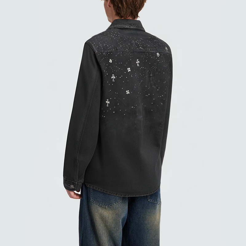 This men’s denim jacket, accented with a cross and starry beading, blends streetwear style with individuality for a unique look. The classic lapel and button closure maintain the traditional denim jacket’s rugged silhouette, creating a crisp, stylish look that easily pairs well with any layering. The delicate beading shimmers subtly in the light, creating a […]