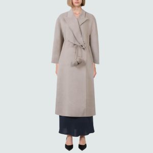 This women’s wool coat features a classic lapel design, showcasing simple elegance and combining comfort with style. The practical side pockets are convenient for storing small items and adding dimension to the overall look. A unique pom-pom embellishment on the front adds a playful and feminine touch. The drawstring waist allows for a flexible adjustment, creating a flattering silhouette and balancing practicality with aesthetics. The soft cashmere fabric provides warmth and comfort, perfect for fall and winter, creating an elegant look for everyday commutes or casual outings.