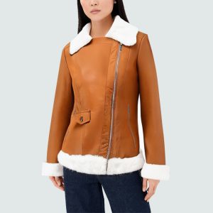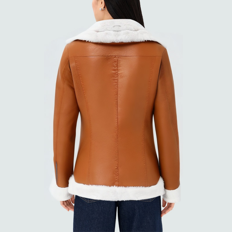 This women’s jacket features a plush, oversized lapel, providing soft comfort and warmth, adding a modern touch to any outfit. The diagonal zipper closure breaks with traditional symmetry, showcasing a casual yet stylish style. Zippered pockets on each side offer both practicality and decorative appeal, showcasing refined details and quality. The leather upholstery is textured, crisp, and stylish, while also offering excellent windproofing, making it an ideal choice for autumn and winter travel. The overall silhouette is fitted, creating a balance of elegance and strength.