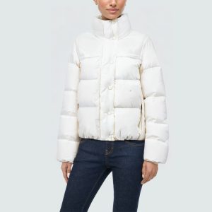This women’s down jacket combines warmth and practicality, designed for cold weather. The stand-up collar provides added neck protection and effectively blocks drafts. The front features a dual zipper and snap closure for easy on and off, while also providing added wind protection. Zippered pockets on both sides provide secure storage for essentials and add a touch of style. Elastic cuffs fit snugly at the wrists to keep out drafts. Filled with light, fluffy duck down, it provides warmth and comfort, making it ideal for everyday commuting and winter outdoor activities.
