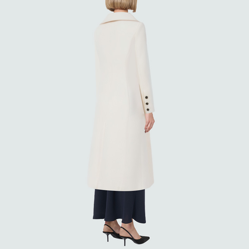 This women’s wool coat exudes elegance with refined tailoring. The notched lapel creates a sharp silhouette and flatters the neck and shoulders, creating a stylish yet practical look. The double-breasted front, embellished with delicate buttons, adds layered sophistication. The waist is cinched with a tonal tie for a custom fit, accentuating the woman’s curves. Concealed […]