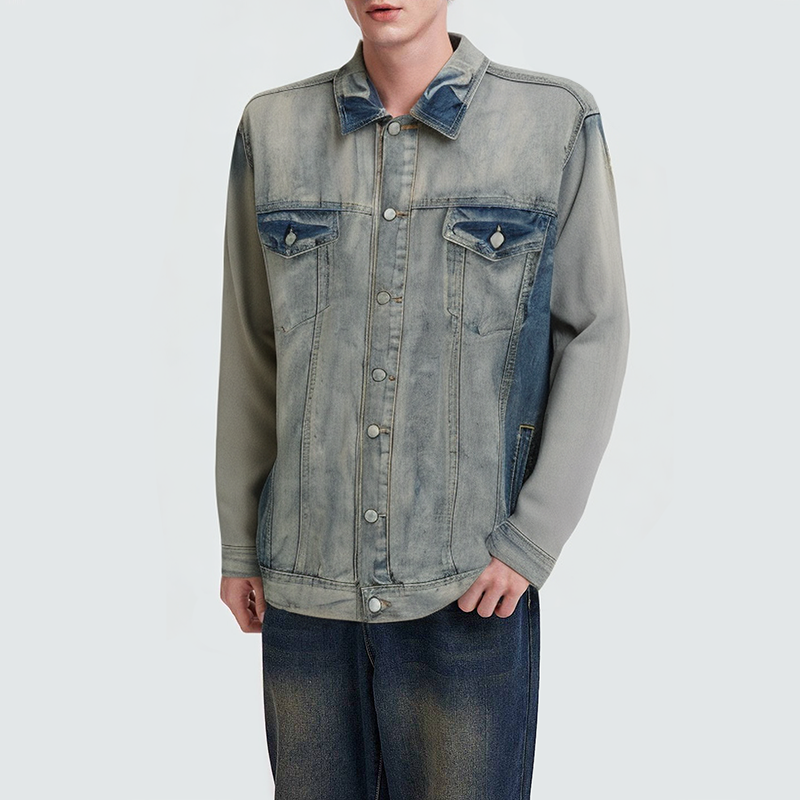 This men's denim jacket features a vintage wash for a naturally faded look and a classic, worn feel, showcasing effortless streetwear style. The simple lapel design and button closure allow for easy on and off, while maintaining a crisp silhouette. Intricate seam details enhance the overall craftsmanship, while the side pockets are both practical and decorative, providing storage and layering. The comfortable fit is perfect for casual everyday wear or layering, effortlessly showcasing a relaxed, effortless style.