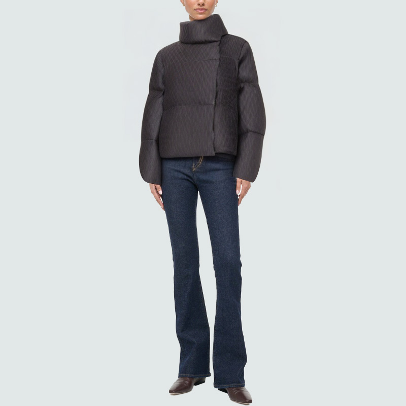 This women's down jacket features a minimalist aesthetic. Crafted from crepe-effect fabric, it creates a natural, textured look, exuding a uniquely understated chic. The high collar effectively blocks wind and cold, enhancing warmth while flattering the neckline and creating an elegant silhouette. The front features a smooth zipper closure for easy on and off, ensuring a secure seal. Practical pockets on both sides are convenient for storing small items or warming hands. Filled with lightweight down, the jacket offers a soft, fluffy feel that provides warmth without bulk. Whether for everyday travel or winter leisure, this down jacket combines comfort with refined style.