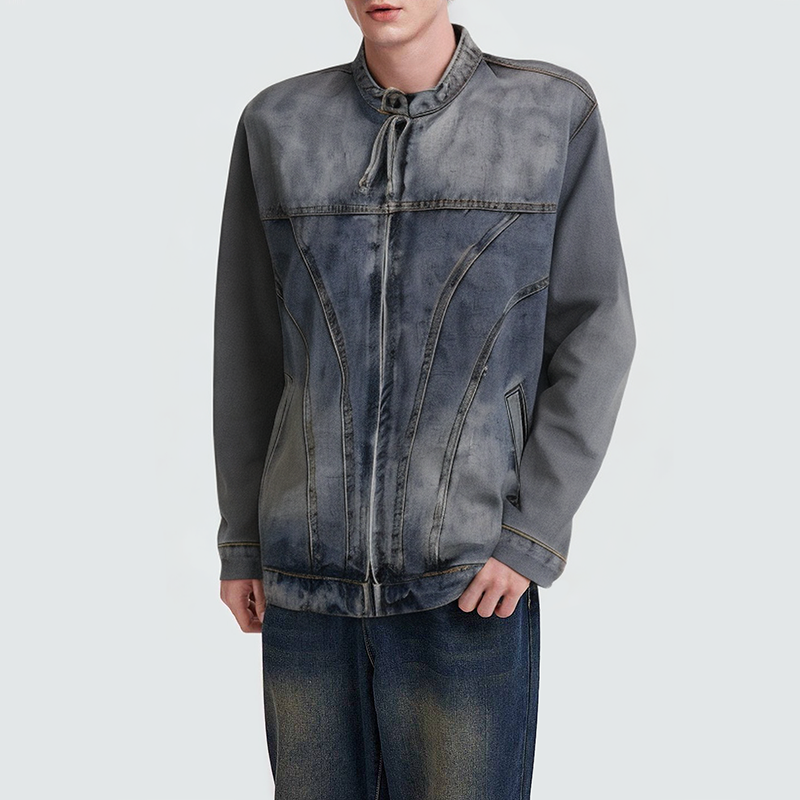 This men's denim jacket features a vintage wash, creating a natural color shift and a distressed texture, creating a classic vintage look. The clean, crisp semi-stand collar, with detailed seams, highlights the craftsmanship and three-dimensional silhouette. The front zipper closure allows for easy on and off, ensuring a secure fit and a clean, streamlined silhouette. The side pockets are both practical and decorative, perfect for storing essentials or keeping your hands warm. The comfortable, loose fit makes it perfect for everyday wear, travel, or streetwear, showcasing effortless, relaxed masculinity.