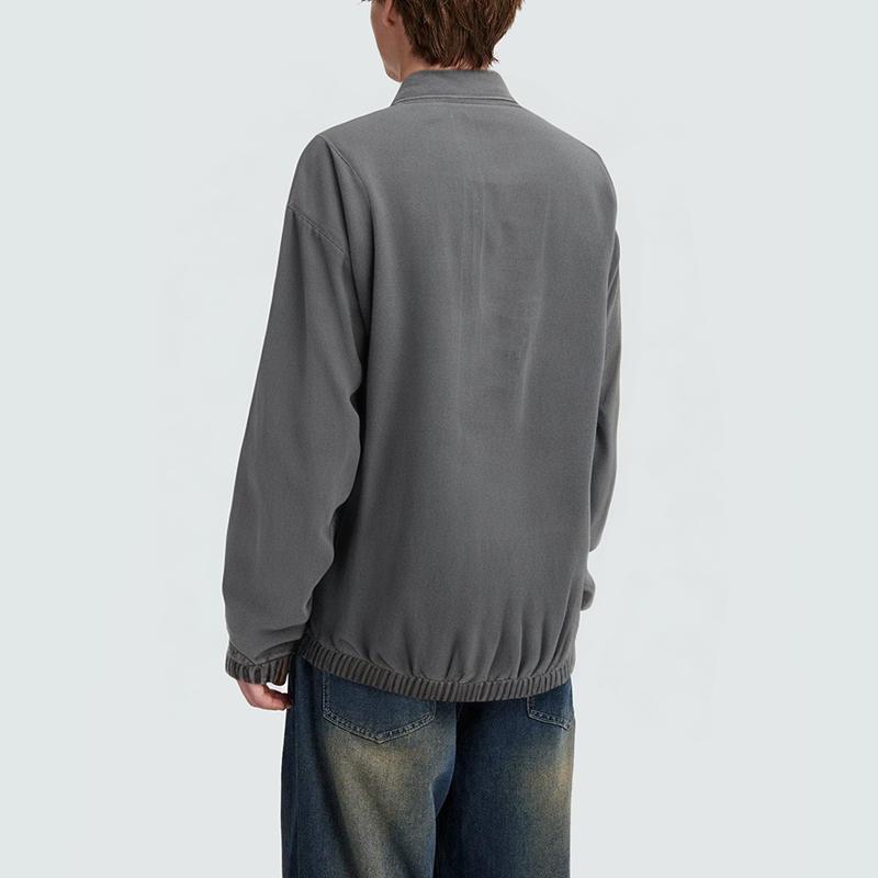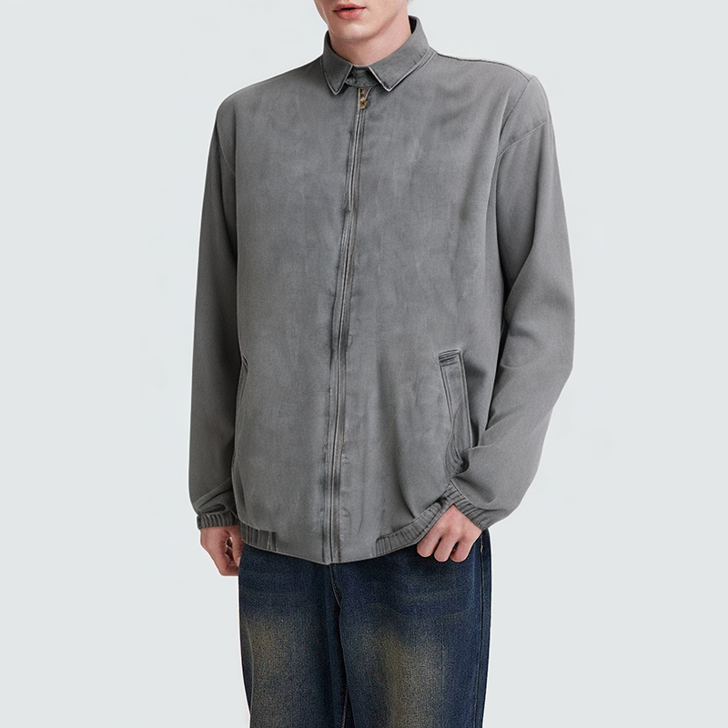 This men's denim jacket features a classic lapel design for a clean, effortless look, showcasing a rugged, casual feel. The front zipper closure allows for easy on and off while maintaining a clean silhouette. The side pockets are practical and decorative, providing essential storage. The elastic cuffs and hem provide a snug fit and comfort, while also offering added wind protection. The overall comfortable fit is perfect for everyday casual wear, streetwear, or layering, effortlessly showcasing a relaxed, effortless style.