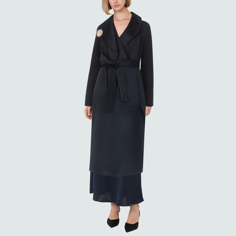 This women's wool coat features classic notched lapels, creating a simple yet elegant silhouette. Practical side pockets provide convenient storage. The waist tie design cleverly defines the waistline, creating an elegant and flattering silhouette. A luxurious metal brooch adds a touch of sophistication and style, elevating the look. Made from premium wool, it's soft and comfortable, yet offers excellent thermal insulation, ensuring warmth and elegance in cold weather.