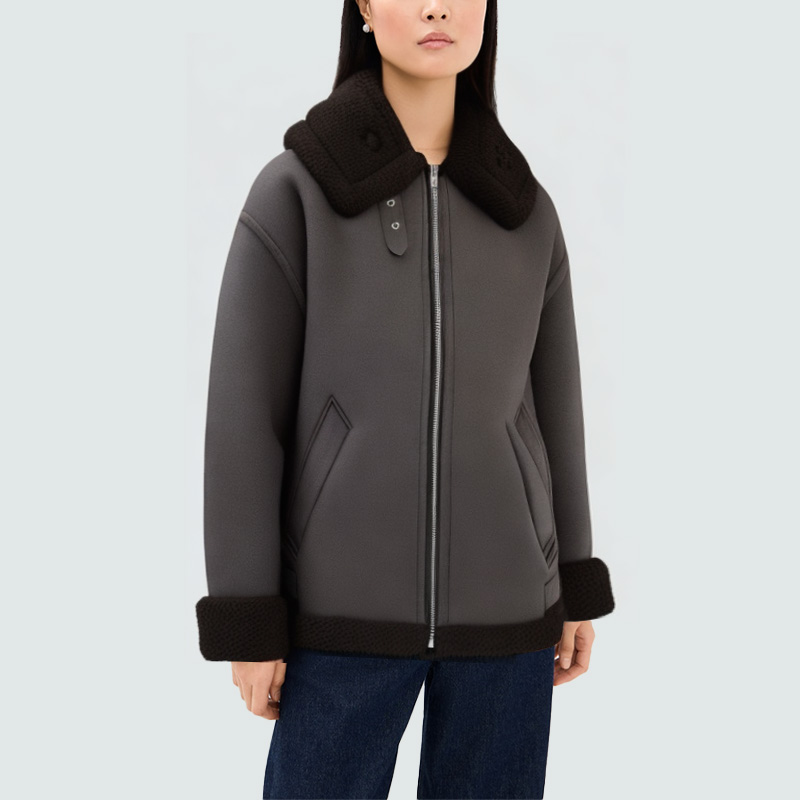 This women's jacket blends style and practicality. Its plush lapel provides warmth and soft texture. The front zipper closure allows for easy on and off, creating a clean, minimalist look. Side pockets provide convenient storage for essentials and add a touch of dimension. The plush lining is soft to the touch and provides excellent warmth, making it perfect for fall and winter. The overall fit is comfortable and snug, perfect for both daily commuting and casual outings.
