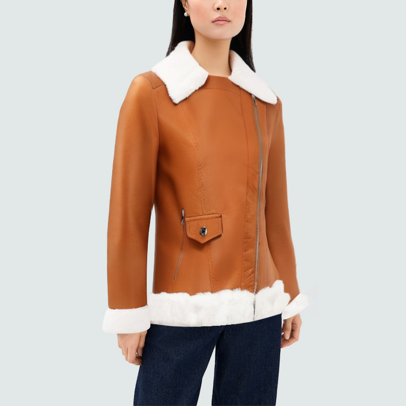 This women's jacket features a plush, oversized lapel, providing soft comfort and warmth, adding a modern touch to any outfit. The diagonal zipper closure breaks with traditional symmetry, showcasing a casual yet stylish style. Zippered pockets on each side offer both practicality and decorative appeal, showcasing refined details and quality. The leather upholstery is textured, crisp, and stylish, while also offering excellent windproofing, making it an ideal choice for autumn and winter travel. The overall silhouette is fitted, creating a balance of elegance and strength.