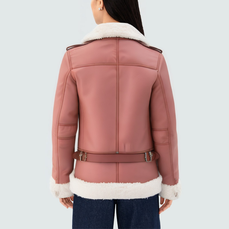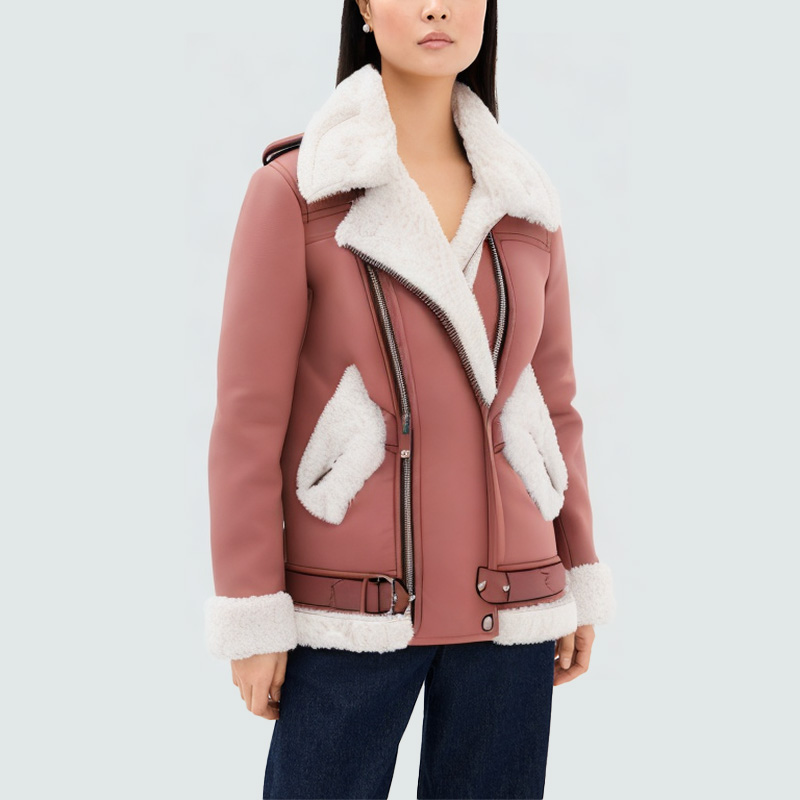 Pink lapel warm women's leather jacket