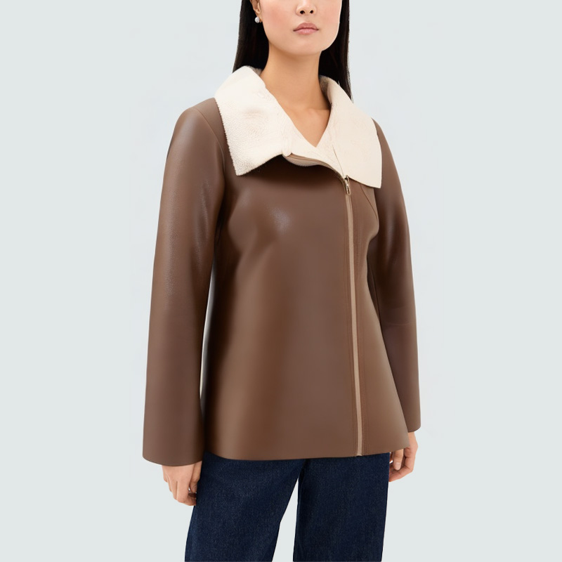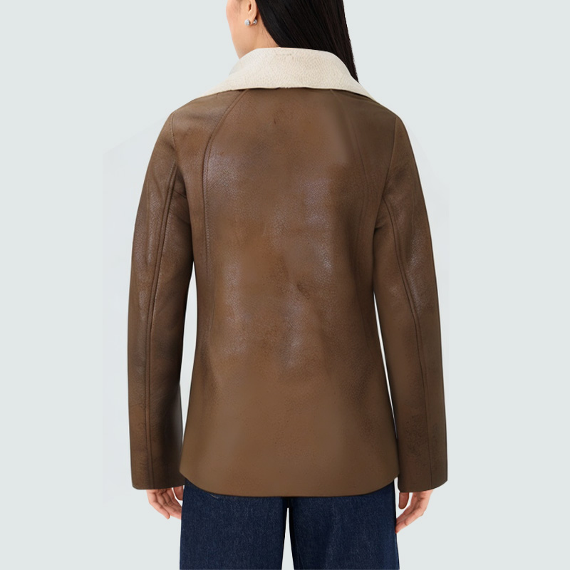 This women's jacket features a vintage leather finish, creating a unique modern retro style that exudes personality and style. The wide lapel and plush material add warmth and softness, while also adding a layered feel to the overall look. The diagonal zipper closure is smooth and easy to put on and take off, while also highlighting the chic aesthetic. The plush lining inside provides additional comfort and warmth, making it even more comfortable in cold weather. The overall shape of the jacket is close-fitting, offering a slim fit and freedom of movement, making it suitable for daily commuting, casual outings, or light outdoor activities.