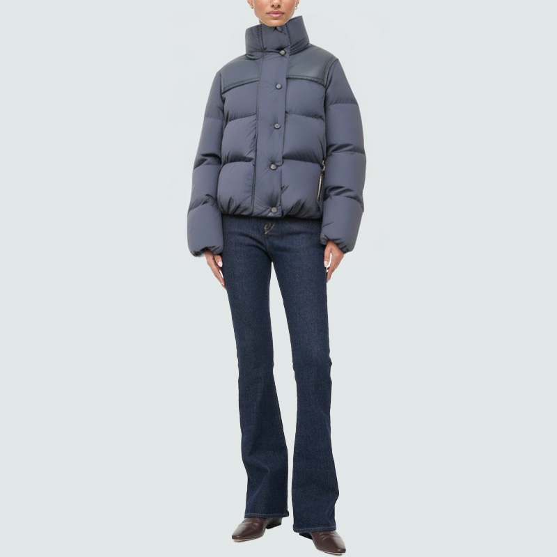 This women's down jacket is designed for cold weather, offering both warmth and comfort. The stand-up collar effectively protects the neck and keeps out wind. The front closure features a zipper and snap button for easy on and off, while also providing added wind protection. Side zippered pockets provide convenient storage and enhance the overall look. Elastic cuffs cling to the wrists for added protection from drafts. The jacket has a comfortable fit and is filled with light and fluffy duck down, providing excellent warmth for everyday winter wear.