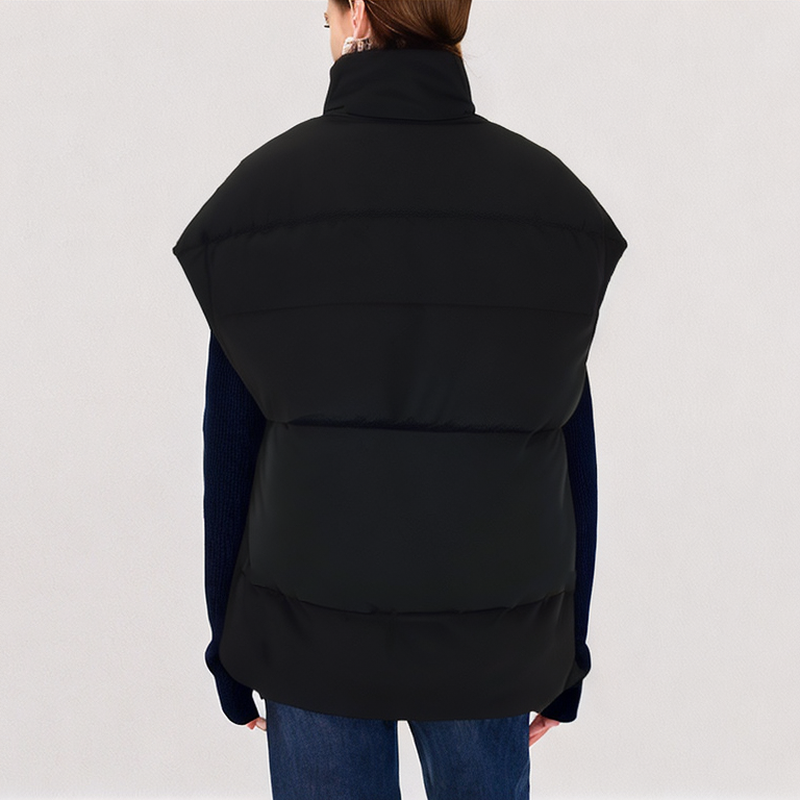 Quilted Design and Pocket Details: The entire vest features a uniform quilted structure with neat and fine stitching, effectively securing the down filling and enhancing overall warmth and the garment's structure. It includes two slanted pockets for hand warmth or storing small items, showcasing exquisite details that balance practicality and aesthetics. The solid black design is simple, versatile, and exudes understated sophistication.