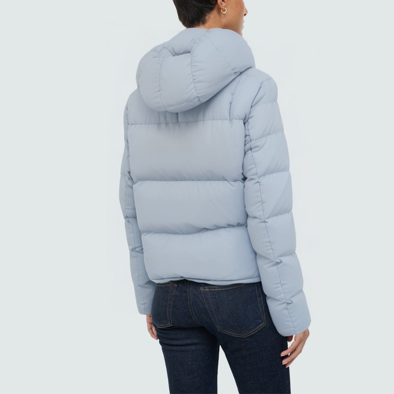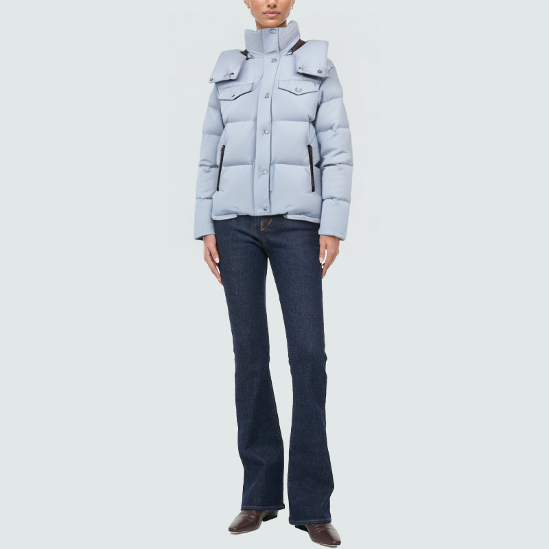This women's down jacket combines warmth and practicality with a simple, elegant design. The detachable hood allows you to adjust it to suit the weather or your style, making it easy to adapt to changing climates. The stand-up collar effectively blocks wind and provides warmth while adding a sleek silhouette. The front closure features a zipper and snap button for secure and easy operation, ensuring warmth and comfort. The two side pockets are practical for carrying small items or warming your hands. The interior is filled with high-quality goose feathers, which are light and fluffy, providing reliable warmth in cold weather. The overall fit is slim but not constricting, combining comfort with a modern look.