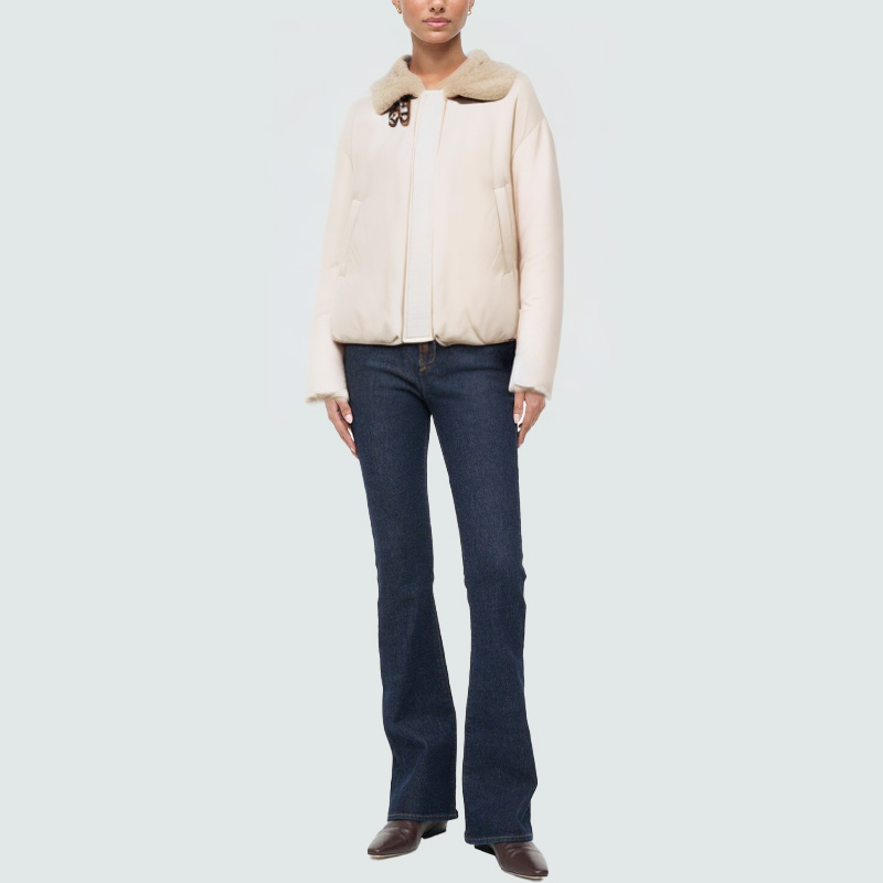 This women's down jacket features a simple, elegant design, perfectly balancing elegance with practical functionality. The soft plush lapel adds a touch of gentleness, creating a refined and elegant look while effectively shielding against cold winds for enhanced winter comfort. The front zipper closure allows for easy on and off, while maintaining a clean, streamlined look. Practical pockets on both sides are convenient for storing small items or warming your hands. The flowing, natural fit provides a comfortable, no-bulk feel, showcasing the woman's curves. The uniform down filling inside provides lightweight yet excellent warmth, making it a perfect winter wear for both daily commutes and leisure outings, showcasing winter elegance.