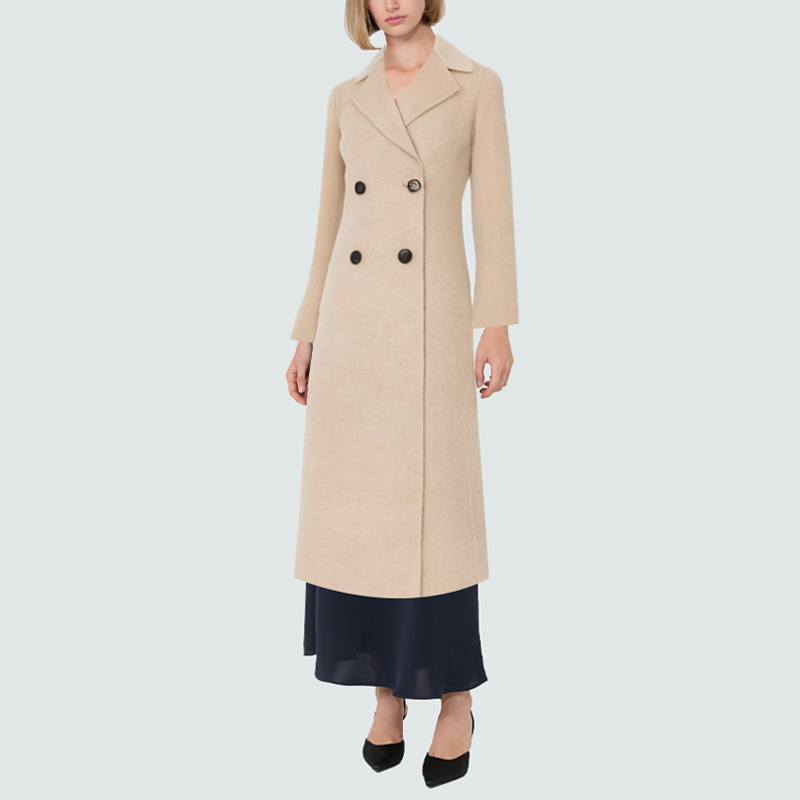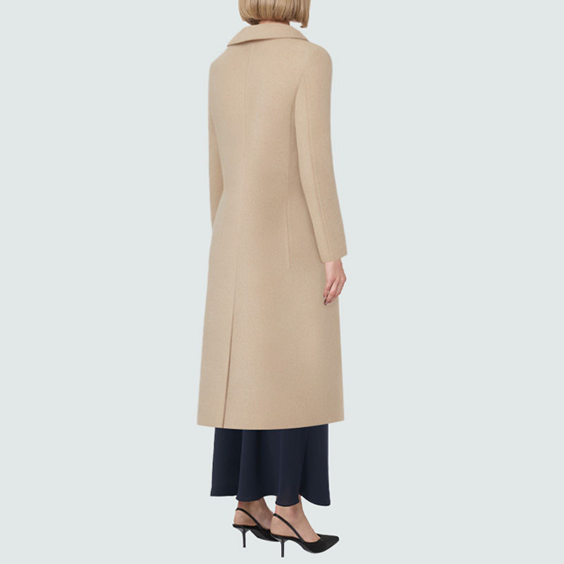 This women's wool coat features classic notched lapels and a double-breasted closure, showcasing a refined and elegant vintage style. Side pockets provide convenient hand warmth and storage, combining practicality with style. The coat's padded design, crafted from a premium wool and nylon blend, offers exceptional warmth while maintaining durability and drape, making it perfect for everyday wear in the fall and winter. The overall fit is versatile, complementing both formal attire and casual outings, creating a warm and stylish look.