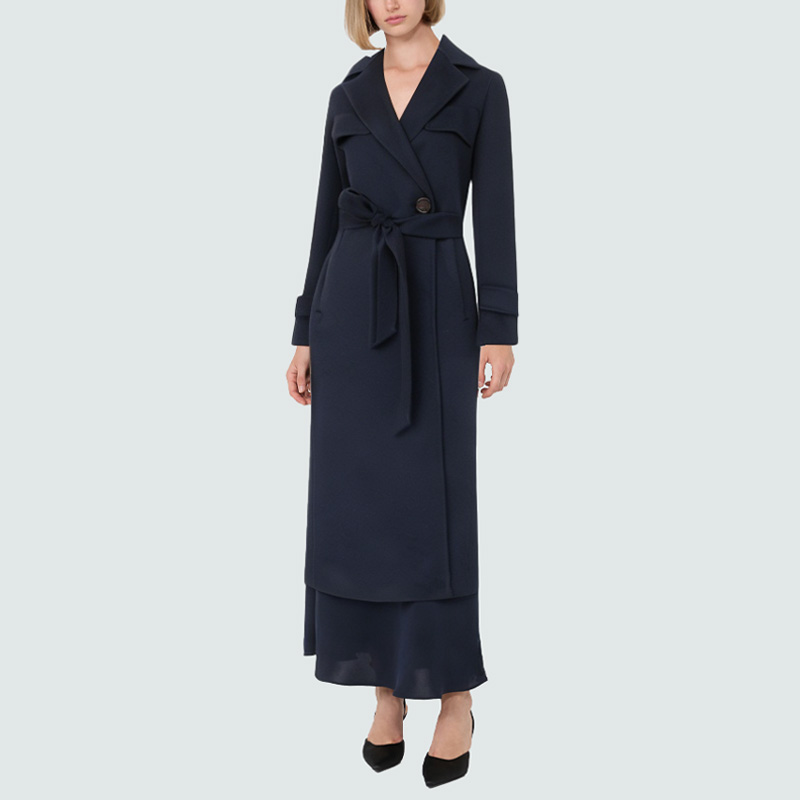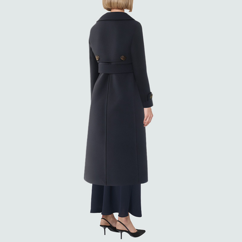 This women's wool coat exudes elegance with its classic, elegant cut. The notched lapel creates a clean, streamlined silhouette, flattering the neck and shoulder proportions for a sophisticated look. The double-breasted front with tonal buttons creates a simple yet practical design, combining decorative appeal with practicality. The adjustable waist tie allows for a custom fit, accentuating the woman's curves. The rear slit allows for increased mobility, adding a touch of lightness and style. The side pockets are both practical and stylish, adding convenience for everyday wear. The crisp fit and excellent warmth make it an ideal choice for winter commuting and leisure activities.