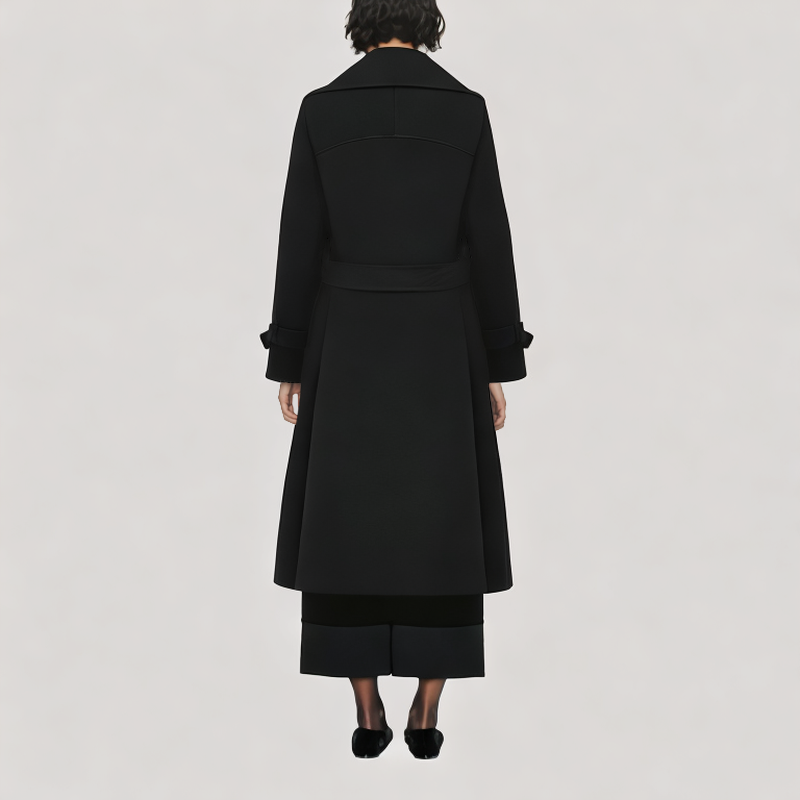 This black wool coat is crafted from sustainable lambswool, offering a soft and refined touch that combines both eco-consciousness and premium quality. The unique woven texture highlights exquisite craftsmanship, while the elegant yet casual cut allows it to effortlessly suit both formal occasions and everyday wear.