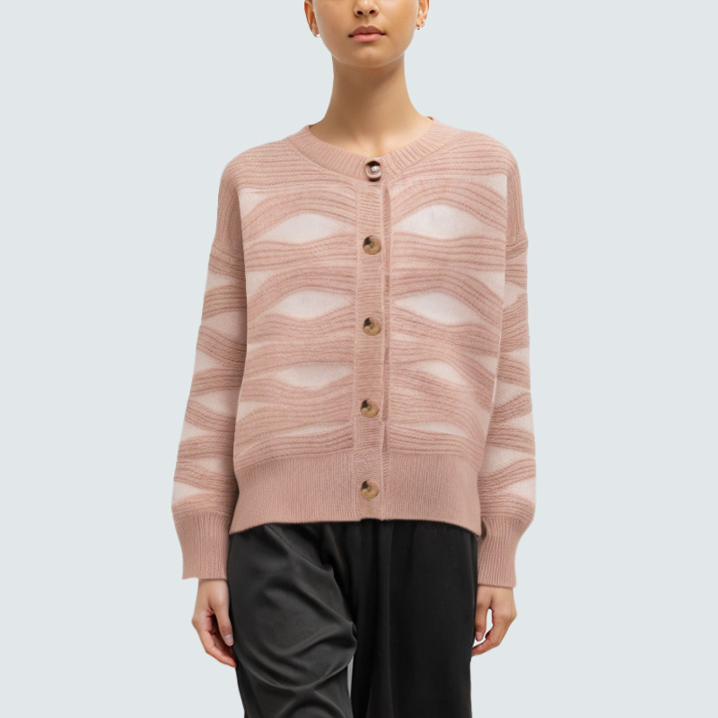 This women's knitted cardigan features a unique wavy stripe design, creating a natural and dynamic texture that adds visual interest and a touch of vitality and style. The classic round neckline is simple and elegant, flattering the neck and easily paired with various tops to create both casual and professional looks. The front features a button closure for easy wear and adds a refined touch to the overall design. The elastic cuffs fit comfortably around the wrists without being restrictive, and the elastic hem enhances the garment's structure and maintains a natural, flattering silhouette. The overall loose and comfortable fit combines practicality and fashion, making it a versatile and easy-to-style knitted piece for any wardrobe.