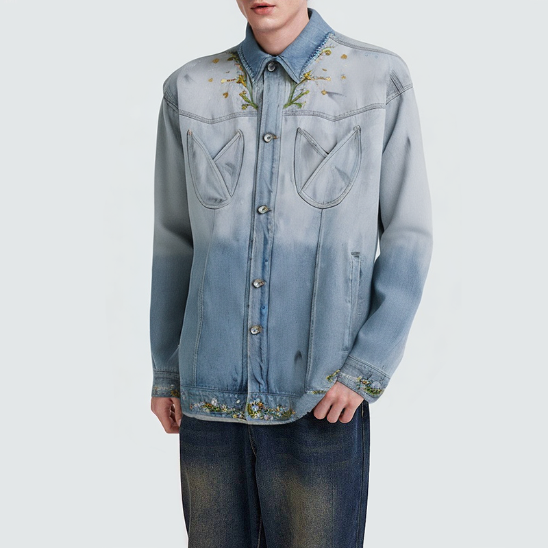 This men's denim jacket features a gradient wash for a unique layered look, complemented by delicate floral embroidery details, showcasing both individuality and artistic flair. The classic lapel design is simple and elegant, highlighting the sculpted silhouette. The button-down front closure allows for easy on and off, ensuring a secure fit and a crisp, stylish look. The practical side pockets provide both storage and decorative functions. The clean-cut design retains the classic style of the denim jacket while infusing it with a modern, fashionable touch through embroidery and gradient tones. It's perfect for everyday wear, casual gatherings, or street style.
