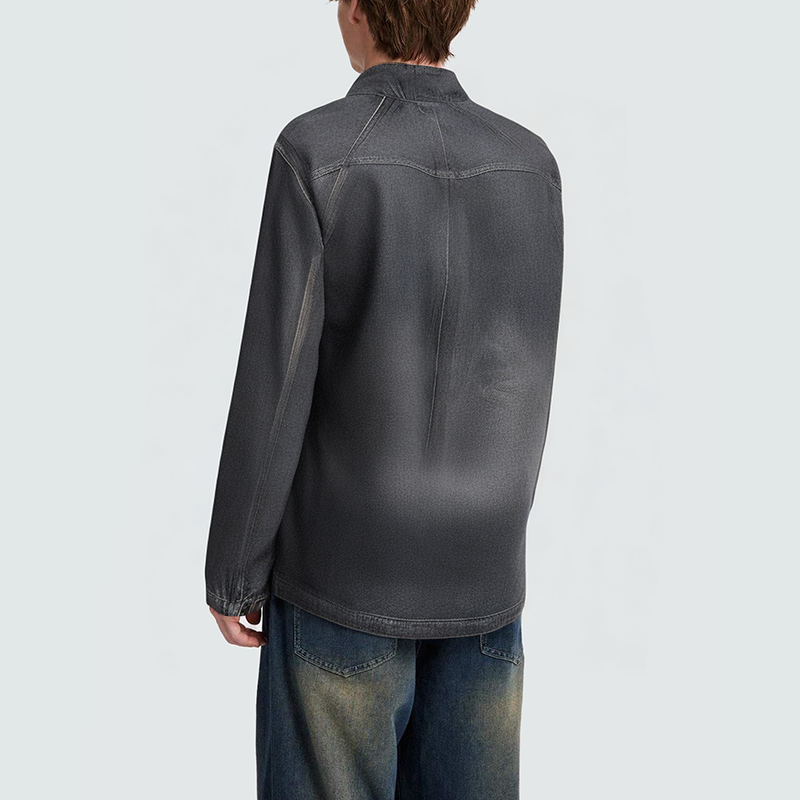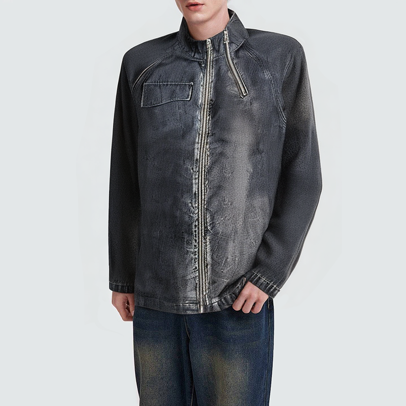 This men's denim jacket features a vintage wash for a uniquely distressed feel, showcasing natural color variations and gradations, highlighting a casual, effortless look. The stand-up collar creates a clean silhouette, and the smooth zipper closure creates a practical yet stylish look. Side pockets allow for easy storage, and the loose fit allows for unrestricted movement, making it perfect for wearing alone or as a layer for a casual yet stylish street style.