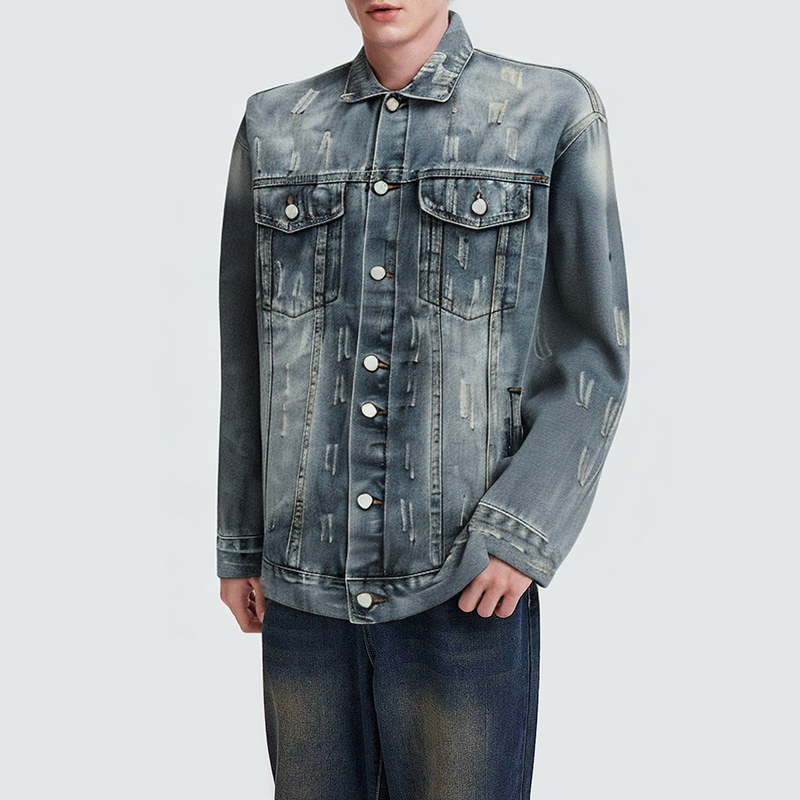 This men's denim jacket features a washed and faded finish, creating a natural color palette and a vintage feel, showcasing classic streetwear style. The lapels are sleek, and the button closure allows for easy on and off, while maintaining a crisp silhouette. The refined seam detailing enhances the overall finish, while the side pockets are both practical and decorative, providing storage and a layered feel. The loose, comfortable fit is perfect for casual everyday wear or layering, creating a relaxed, effortless look.