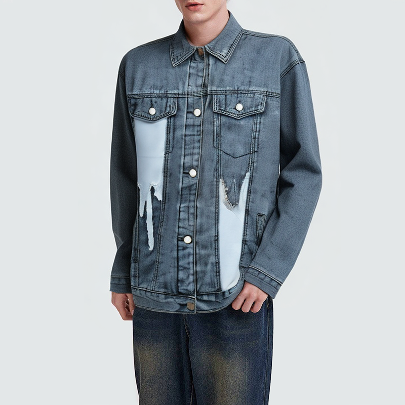 This men's denim jacket features a patchwork design that combines different fabrics or color blocks, creating a unique layered look and a stylish street style. The lapels are sleek and the button closure allows for easy on and off, while maintaining a crisp silhouette. The detailed seams enhance the craftsmanship and dimensionality of the silhouette. The side pockets are both practical and decorative, providing storage and adding dimension to the overall look. The comfortable fit is perfect for casual everyday wear or layering, effortlessly showcasing a relaxed, effortless style.