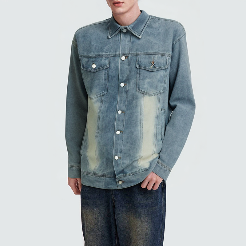 This men's denim jacket features a washed and faded finish for a naturally worn and vintage feel, showcasing a classic streetwear-inspired style. The simple, sleek lapel design and button closure provide easy on and off while maintaining a crisp silhouette. Exquisite seam details enhance the craftsmanship and dimensionality. Side pockets are both practical and decorative, providing storage and a versatile addition to the overall look. The loose, comfortable fit makes it perfect for casual everyday wear or layering, showcasing effortless, effortless style.