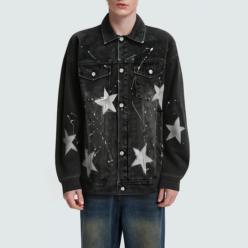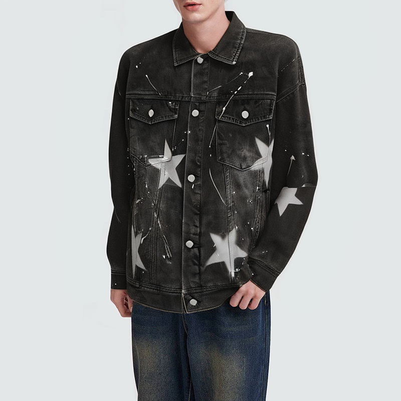 This men's denim jacket features a star pattern, adding a playful and fashionable touch, showcasing a unique streetwear style. The classic lapel design and button closure offer a clean, elegant fit while maintaining a crisp silhouette. The refined seam details enhance the jacket's craftsmanship, while the side pockets are both practical and decorative, perfect for storing essentials and adding a layered feel. The comfortable fit is perfect for casual everyday wear or layering, creating a relaxed, effortless look.