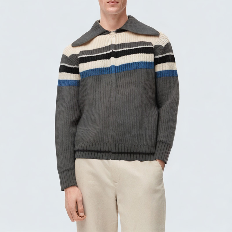 This men's knitted jacket features a classic striped knit design with clean, simple lines, adding layering and style to any outfit. The polo collar design is simple and elegant, flattering the neckline and enhancing the overall polished look, suitable for various casual or business casual occasions. The front features a zipper closure for easy on and off, making it convenient for everyday wear. The elastic cuffs fit comfortably around the wrists without being too tight; the relaxed fit allows for freedom of movement and comfort, easily pairing with inner layers to create a casual and effortless look. The overall design is simple and practical, making it a versatile and easy-to-wear knit piece for any man's wardrobe.