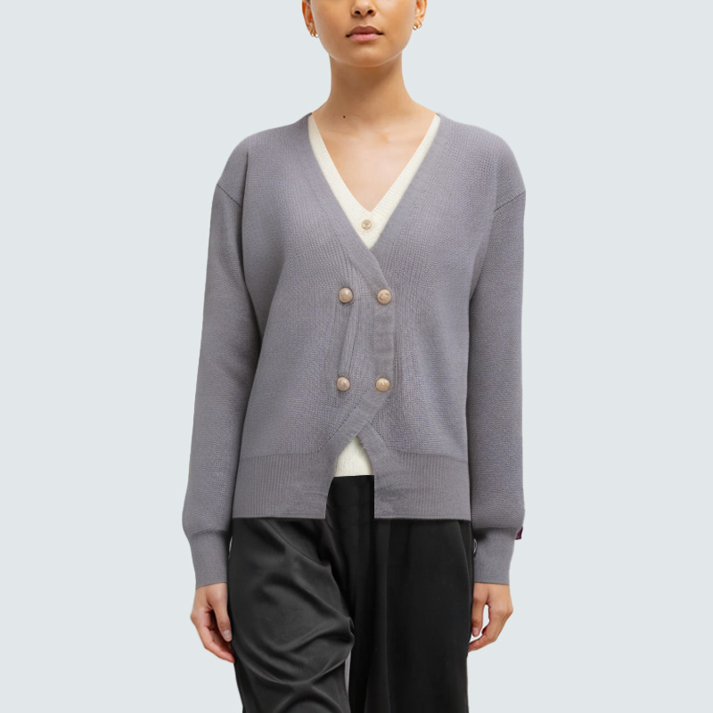 This women's knitted cardigan features a clever faux two-piece design, creating a rich layered look and a stylish, three-dimensional effect. The V-neckline naturally flatters the neck and collarbone, elongating the upper body and showcasing a sophisticated and elegant temperament. The double-breasted design at the front is neat and stylish, easy to put on and take off, and enhances the overall refined look. The elastic cuffs fit comfortably around the wrists without being tight; the elastic hem enhances the fit and helps maintain the garment's shape, allowing for unrestricted movement. The overall loose and natural fit combines comfort and style, making it suitable for commuting, casual wear, and various daily occasions. It's a versatile and practical knitted item for your wardrobe.