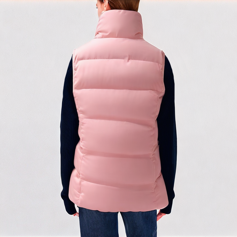 Suitable Occasions and Functionality: This warm down vest is suitable for daily commutes, casual outings, and outdoor activities. The stand-up collar provides neck protection, while white duck down filling ensures warmth in the core area. Zippered pockets and quilted details enhance practicality and the garment's structure. With its simple and versatile style, this is an essential piece for every woman's autumn/winter wardrobe, combining warmth and practicality.